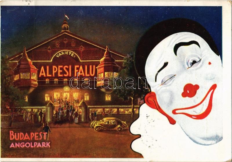 1936 Budapest XIV. Alpesi Falu Barieté az Angol parkban. Reklámlap boh... https://www.darabanth.com/de/33-Gross-Auktion/33.1/Ansichtskarten/Zirkus~13972/1936-Budapest-XIV-Alpesi-Falu-Bariete-az-Angol-parkban-Reklamlap-bohoccal-15-cm-x-10-3-cm-H~II2139293