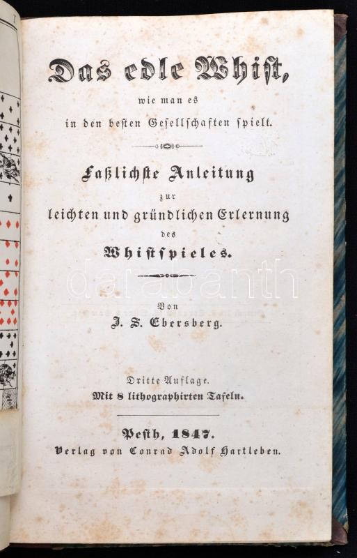 J[ospeh] S[iegmund]. Ebersberg: Das edle Whist, wie man es in den besten Gesellschaften spielt. Fasslichste Anleitung zur leichten und gründlichen Erlernung des Whistspieles. Pest, 1847, Conrad Adolf Hartleben, VIII+8-112 p.+VIII t. (színes kihajtható litográfiák.) 3. kiadás. Német nyelven. Korabeli aranyozott gerincű félvászon-kötésben, kopott borítóval, kissé foltos lapokkal./ In German language. Half-linen-binding, with gilt spine, with worn cover, and little bit spotty pages.