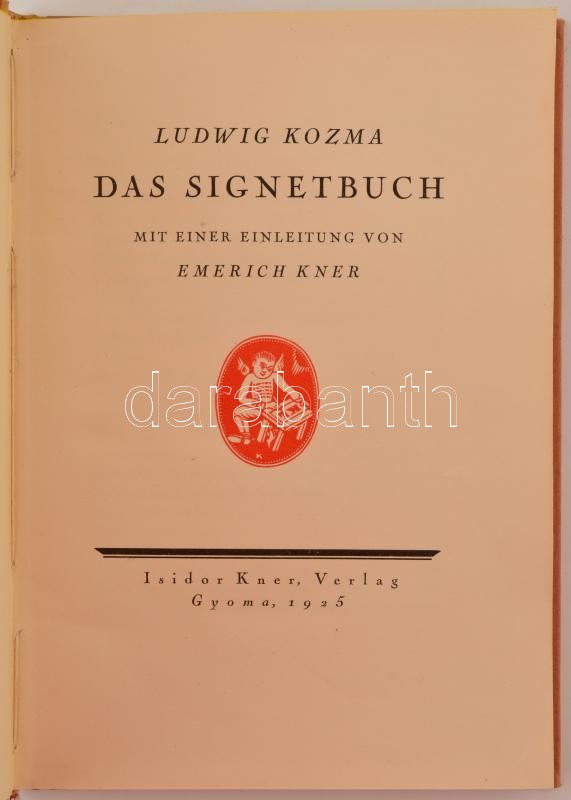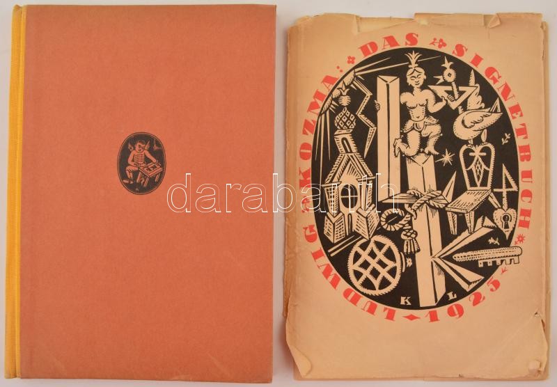[Kozma Lajos] Kozma, Ludwig: Das signetbuch. Mit einer einleitung Emerich Kner. Gyoma, 1925., Kner Isidor, XIX+50 p. Német nyelven. Kiadói félvászon-kötés, kiadói illusztrált papÃr védÅ‘borÃtóban, az illusztrált papÃrborÃtó ketté szakadt, sérült, de maga a könyv jó állapotban. A magyar nyelvű kiadással egyidejűleg jelent meg 400 példányban./ In German language. Half-linen-binding, with illustrated paper cover, the paper cover damaged, but the other things are okay. Published in 400 copies.