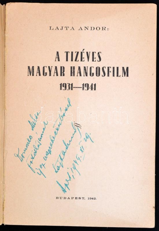 Lajta Andor: A tízéves magyar hangosfilm 1931-1941. Dedikált! Bp.,1942, Otthon-Nyomda. Kiadói papírkötés, kiadói papír védőborítóban, a papír védőborító kissé szakadozott