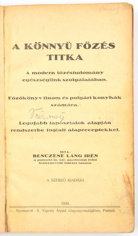 Benczéné Láng Irén: A könnyű főzés titka. A modern főzéstudomány egészségünk szolgálatában. Főzőkönyv finom és polgári konyha számára. Legujabb tapasztalatok alapján rendszerbe foglalt alapreceptekkel. Dr. Krajnik Mór által összeállított diétás étrendekkel. Dr. Czvetkovits Ferenc miniszteri tanácsos a Földmiv. Minisztérium gazd. szakoktatási osztályának vezetőjének előszavával. Szerzői kiadás. Putnok, 1934., S. Tapody Árpád-ny., 330 p. Nagyon ritka, putnoki kiadású szakácskönyv. Aukción csak egyszer szerepelt. Átkötött kopott, foltos félvászon-kötés, egy-két bejelöléssel, de belül jó állapotban.