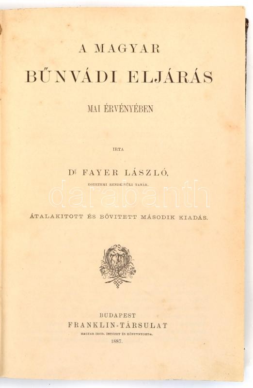 Dr. Fayer László: A magyar bűnvádi eljárás mai érvényben. Bp., 1887, Franklin, XVI+413+1 p. Második, átalakított és bővített kiadás. Átkötött félvászon-kötésben, márványozott lapélekkel, kissé kopott gerinccel, kissé dohos. Ritka!