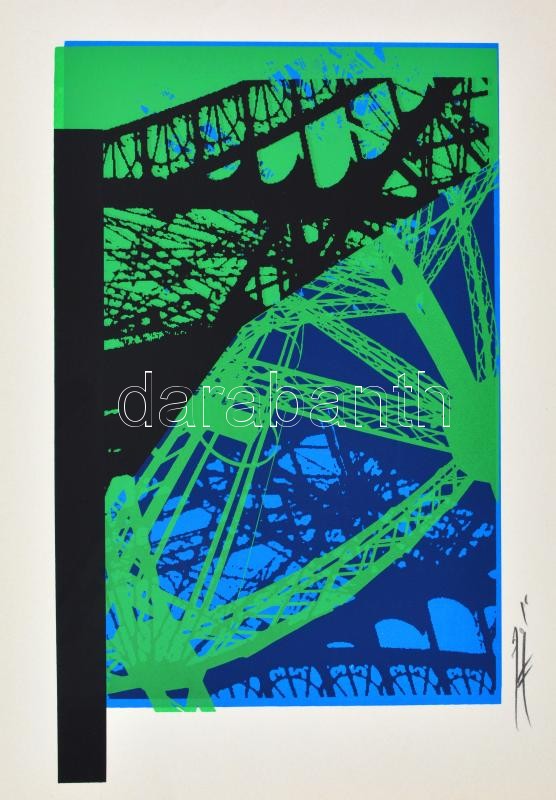 Hervé, Rodolf (1957-2000): Eiffel-torony. Szitanyomat, papÃr, jelzett, 36,5x21,5 cm. / Hervé, Rodolf (1957-2000): Eiffel-tower. Screenprint on paper, signed, 36,5x21,5 cm. Photographer Rodolf Hervé was born in Paris, his father was famous photographer Lucien Hervé. This screenprint is part of a series of 12 works depicting the cultural icon of France.