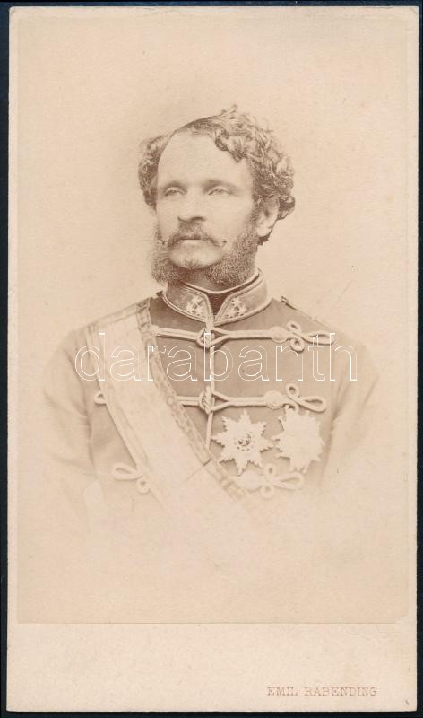 cca 1867-1870 Gróf Andrássy Gyula (1823-1890) miniszterelnök huszártiszti egyenruhában, a Szent István renddel, keményhátú fotó, Bécs, Emil Rabending, 11x6 cm