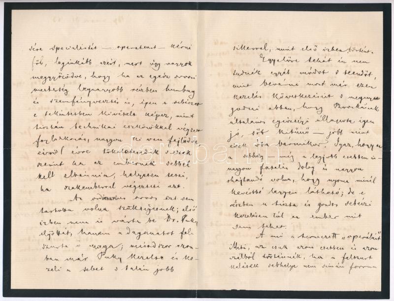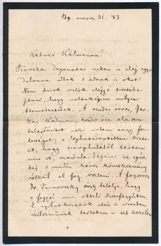 1883 Arany László (1844-1898) levele sógorának, Szél Kálmán nagyszalontai esperesnek, melyben részletesen értekezik Szél Piroska (1865-1886) állapotáról és megosztja meglátását, miszerint: "ha az egész orvsoi mesterség legnagyobb részben humbug és szemfényvesztés is, éppen a sebészet e tekintetben kivételt képez". 4 beírt oldal.