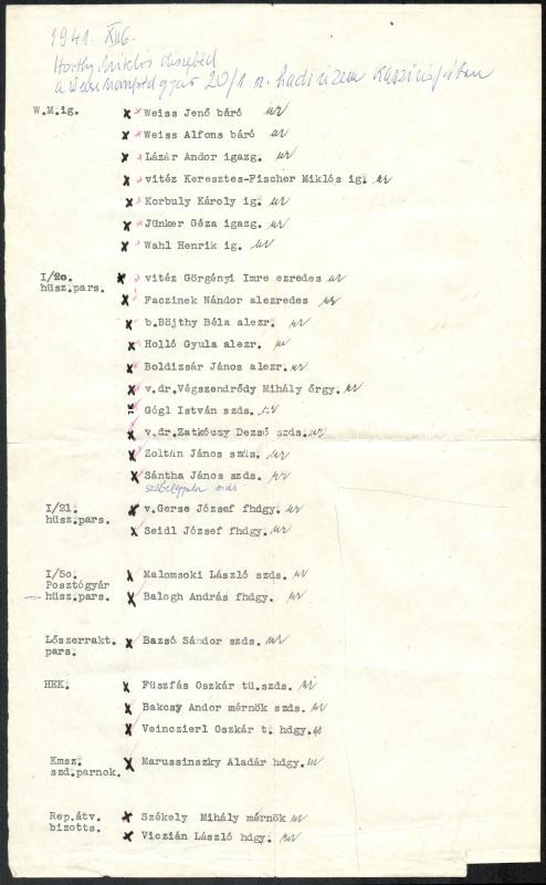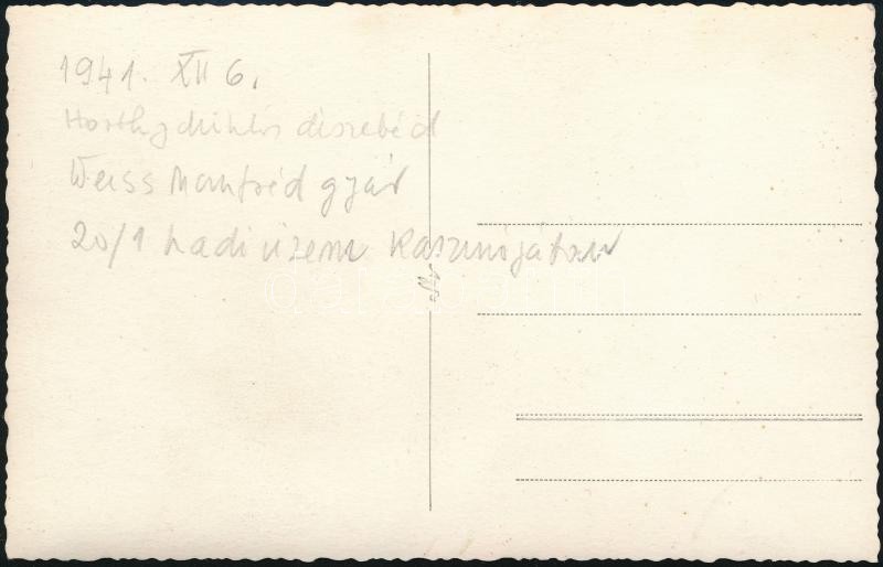 1941 Weiss Manfréd Gyár 20/1. kaszinójában rendezett, 1941. XII. 6. Horthy Miklós tiszteletére rendezett Miklós napi díszebéd fotója (fotólap, 8x13 cm), ülésrenddel, névjegyzékkel rajta báró Weiss Jenő, báró Weiss Alfonz, Lázár Andor ny. igazságügyi miniszter, vitéz Keresztes-Fischer Miklós és mások.