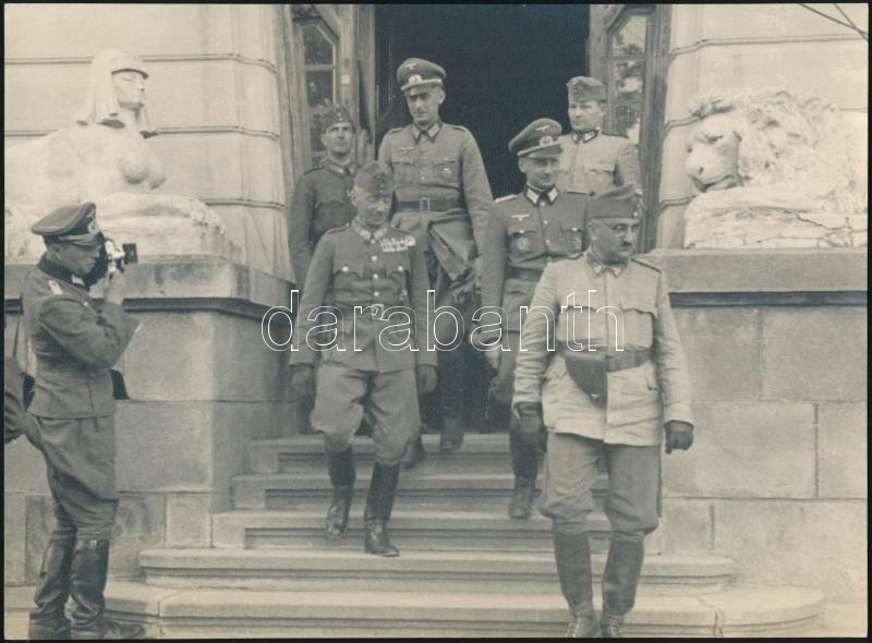 cca 1941-1944 Csatay Lajos (1886-1944) vezérezredes, Kállai és Sztójay-kormányok honvédelmi minisztere, és Beregfy Károly (1888-1946) vezérezredes, a Szálasi-kormány honvédelmi minisztere, magas rangú német tisztekkel és tábornokokkal, fotó, 16x22 cm / cca 1941-44 general Lajos Csatay (1886-1944), minister of defence (1942-44) and general Károly Beregfy (1888-1946), minister of defence of the Szálasi government in 1944-45, with high ranking german officers and generals, photo 16x22 cm