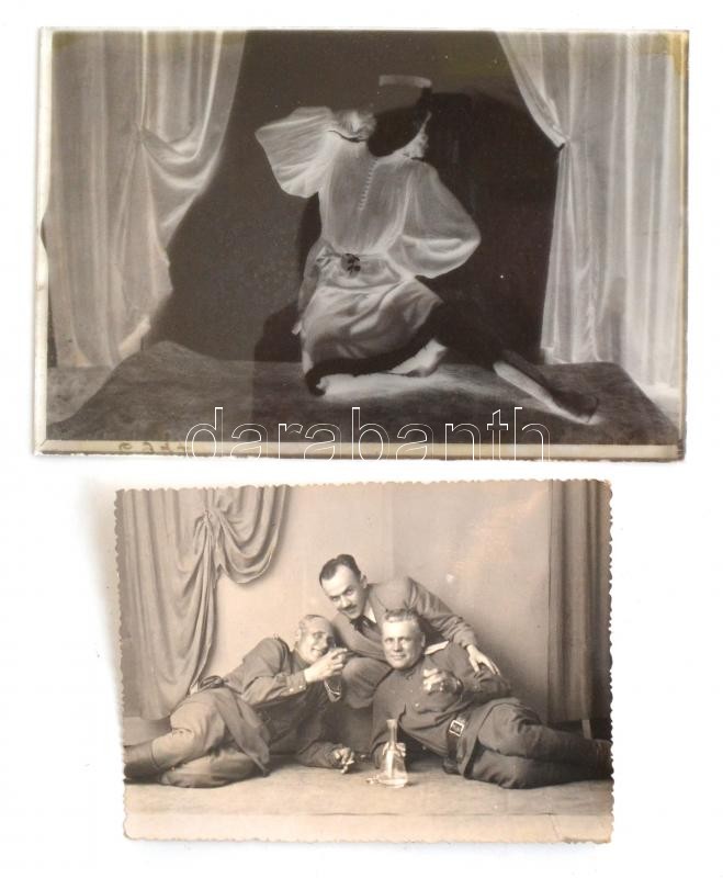 cca 1945 Orosz hölgy és orosz katonák, a kiskunfélegyházi Marika-Fotó műterem hagyatékából 1 db vintage üveglemez negatív (15x10 cm) + 1 db vintage fotó, feliratozva, 8x11 cm / Russian lady and soldiers
