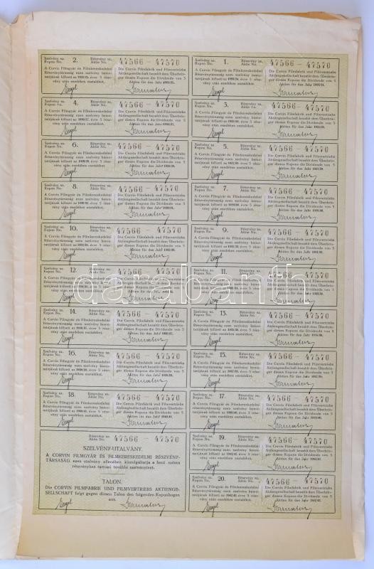 Budapest 1923. "Corvin Filmgyár és filmkereskedelmi r.t." öt darab részvénye egyben összesen 10.000K-ról, szelvényekkel, bélyegzéssel, szárazpecséttel T:III / Hungary / Budapest 1923. "Corvin Filmfabrik und Filmvertriebs a.g." five shares in one about 10.000 Korona, with coupons, overprint and embossed stamp C:F