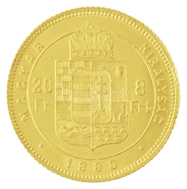 1880KB 8Ft/20Fr Au "Ferenc József / Középcímer" Körmöcbánya ... https://www.darabanth.com/de/33-Gross-Auktion/33.1/Numismatik/Goldmunzen-und-Gedenkmunzen~13836/1880KB-8Ft20Fr-Au-Ferenc-Jozsef-Kozepcimer-Kormocbanya-6-46g0900-T1-1-Hungary-18~II2129996
