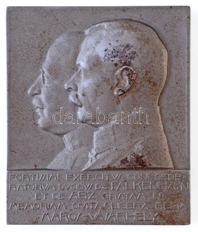 Osztrák-Magyar Monarchia 1916. "FORTISSIMI EXERCITVS CONFOEDERATORVM DVCIBVS DE FALKENHAYN ET DE ARZ GRATAM IN MEMORIAM CIVITAS LIBERA REGIA MAROS-VÁSÁRHELY / IN MEMORIAM TRANSYLVANIAE AB IMMANI HOSTE VALACHO LIBERATAE - ANNO ALVTIS MDCCCCXVI" kétoldalas, fém plakett, jelzetlen Telcs Ede (65x55mm) T:2 fo. / Austro-Hungarian Monarchy 1916. "FORTISSIMI EXERCITVS CONFOEDERATORVM DVCIBVS DE FALKENHAYN ET DE ARZ GRATAM IN MEMORIAM CIVITAS LIBERA REGIA MAROS-VÁSÁRHELY / IN MEMORIAM TRANSYLVANIAE AB IMMANI HOSTE VALACHO LIBERATAE - ANNO ALVTIS MDCCCCXVI" double-sided commemorative plaque, unsigned Ede Telcs (65x55mm) C:XF spotted
