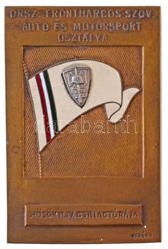 Berán Nándor (1889-1965) ~1930. "ORSZ. FRONTHARCOS SZÖV. AUTO ÉS MOTORSPORT OSZTÁLYA - HŐSÖK III. IV. CSILLAGTÚRÁJA" egyoldalas Br plakett zománcozott zászlóval és a szövetség címerével, hátlapon gyártói jelzés "BUDAPEST DÖBRENTEI U.2." (53,53g/65x42mm) T:2 / Hungary ~1930. "ORSZ. FRONTHARCOS SZÖV. AUTO ÉS MOTORSPORT OSZTÁLYA - HŐSÖK III. IV. CSILLAGTÚRÁJA" one-sided Br plaque with enamel inlay flag. Sign.: Nándor Berán (53,53g/65x42mm) C:XF