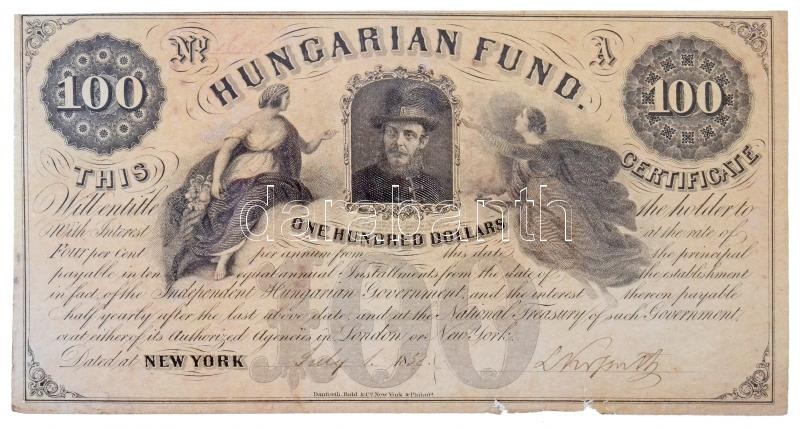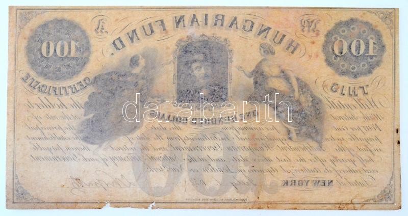 1852. 100$ "Kossuth bankó" piros tintás kézi sorszám és dátum, Kossuth Lajos saját kezű aláírásával, bal alsó sarokban a sorszámozásnál alkalmazott rögzítés tűnyoma, T:III,III- anyaghiány / 1852. 100$ "Kossuth bankó" hand written serial and date with red Ink and signature of Louis Kossuth. In the lower left corner needle hole from the fastening during the serial number writing procedure C:F,VG missing material