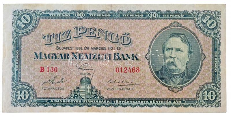 1926. 10P "B 130 012468" T:III szép papír / Hungary 1926. 10... https://www.darabanth.com/de/33-Gross-Auktion/33.1/Numismatik/Ungarische-und-Auslandische-Banknoten~13837/1926-10P-B-130-012468-TIII-szep-papir-Hungary-1926-10-Pengo-B-130-012468-CF-fine-paper-~II2129713