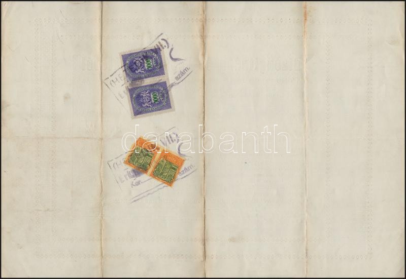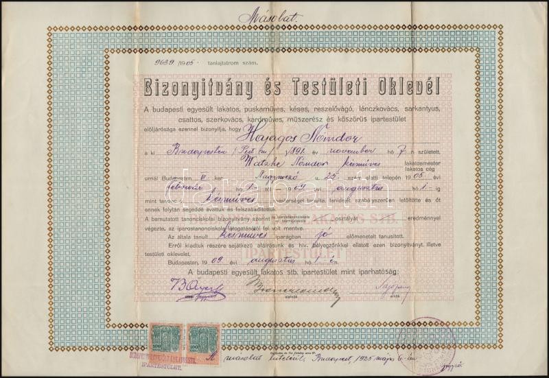 1909 Bizonyítvány és Testületi Oklevél a budapesti egyesült lakatos, puskaműves, késes, reszelővágó, lánckovács, sarkantyús, csattos, szerkovács, kardműves, műszerész és köszörűs ipartestület által kiállítva, okmánybélyeggel, aláírásokkal, pecséttel, 30x43,5 cm