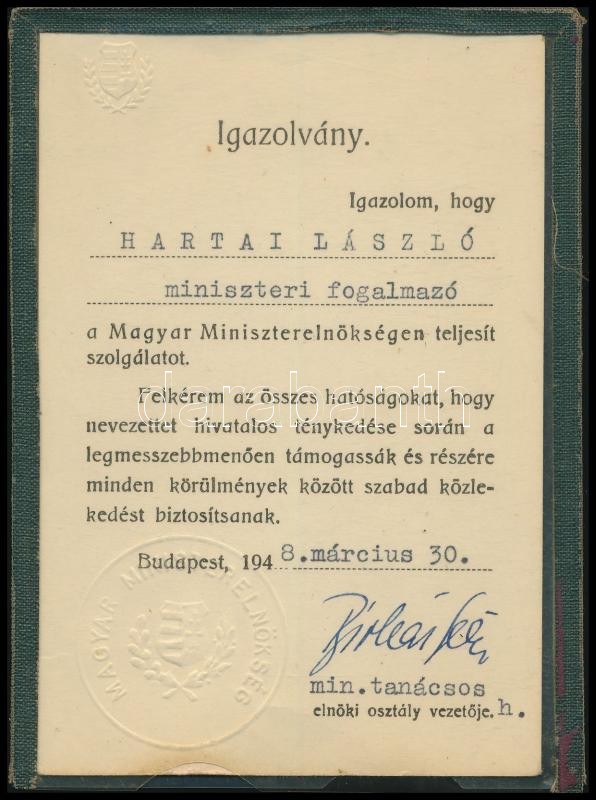 1948 Hartai László (1925-1987) későbbi legfelsőbb bíró miniszteri foga... https://www.darabanth.com/de/330-Fernauktion/330.0/Andere-Sammelgebiete/Dokument~500016/1948-Hartai-Laszlo-1925-1987-kesobbi-legfelsobb-biro-miniszteri-fogalmazoi-igazolvanya~II1839269