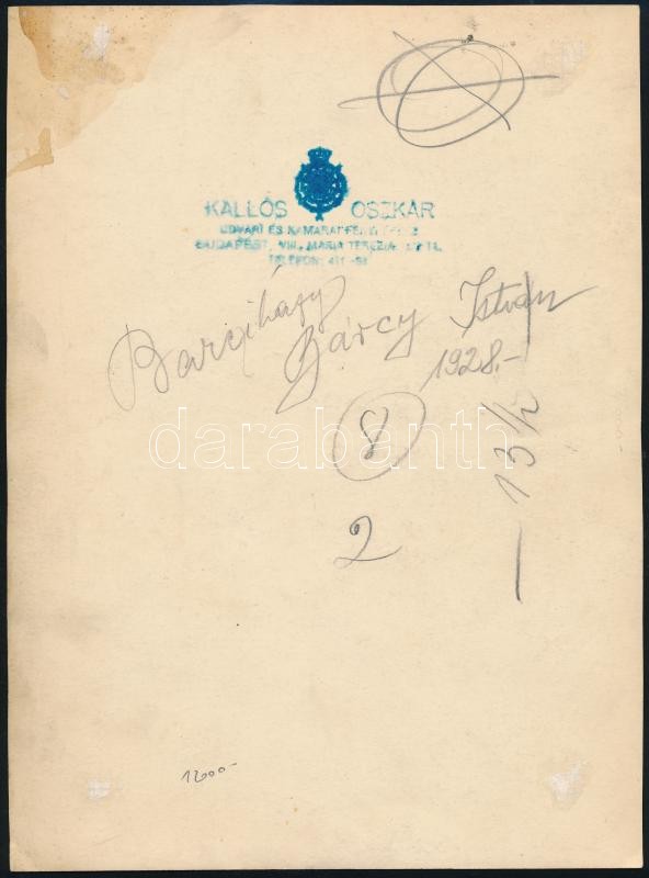 Beschreibung: 1928 Bárcziházi Bárczy István (1882-1952 miniszterelnöki hivatal államtitkár-helyettese, fotó Kallós Oszkár műterméből, hátoldalán feliratozva, 23x17 cm