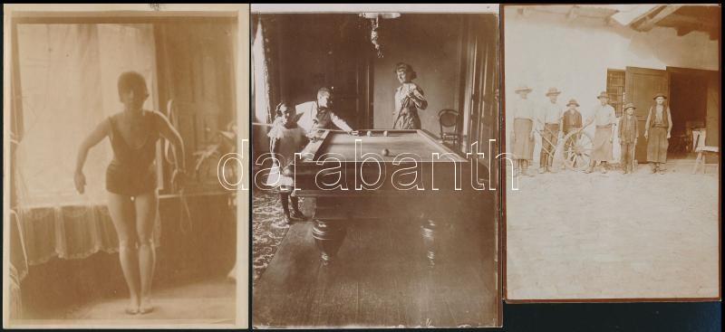 Beschreibung: cca 1880-1910 Vegyes fotó tétel: mosónő tóparton, evezés a Dunán, tanyasi gyerekek, somoskőújfalui bognár műhely, stb., 6 db fotó, 8,5×12 cm