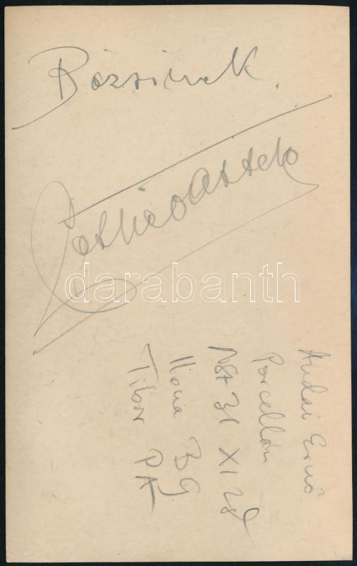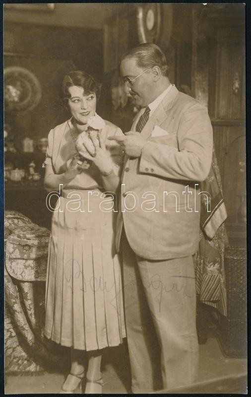 Beschreibung: cca 1931 Bajor Gizi (1893-1951) színésznő Pethő Attila színész társaságában, fotó, rajta aláírásukkal, 14×8,5 cm