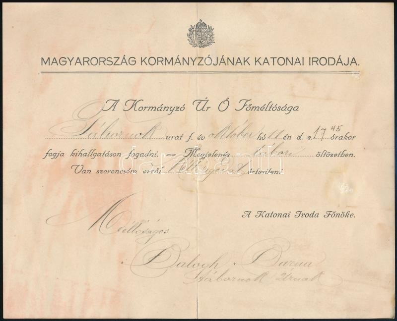 cca 1930 Magyarország Kormányzójának Katonai Irodája által kiadott meg... https://www.darabanth.com/de/330-Fernauktion/330.0/Andere-Sammelgebiete/Militaria~500027/cca-1930-Magyarorszag-Kormanyzojanak-Katonai-Irodaja-altal-kiadott-meghivo-kihallgatasra~II1844361