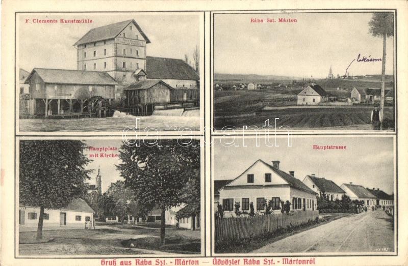Rábaszentmárton, Németszentmárton, Sankt Martin an der Raab; F. Clements Kunstmühle, Hauptlplatz mit Kirche, Hauptstrasse. R. Andrecs Fotograf, Verlag Georg Mandl / Franz Clement műmalom, Fő tér, templom, Fő utca, látkép / mill, main square, church, main street, general view (EK)