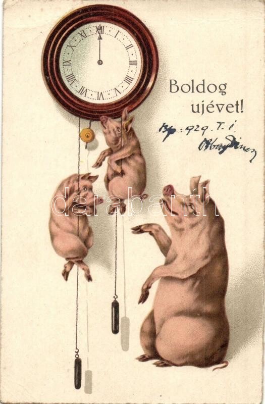 Boldog Újévet! / New Year greeting card, pigs with a clock. litho (EK) https://www.darabanth.com/de/330-Fernauktion/330.0/Ansichtskarten/GruC39Fkarten-Feste~2000072/Boldog-Ujevet-New-Year-greeting-card-pigs-with-a-clock-litho-EK~II1840281