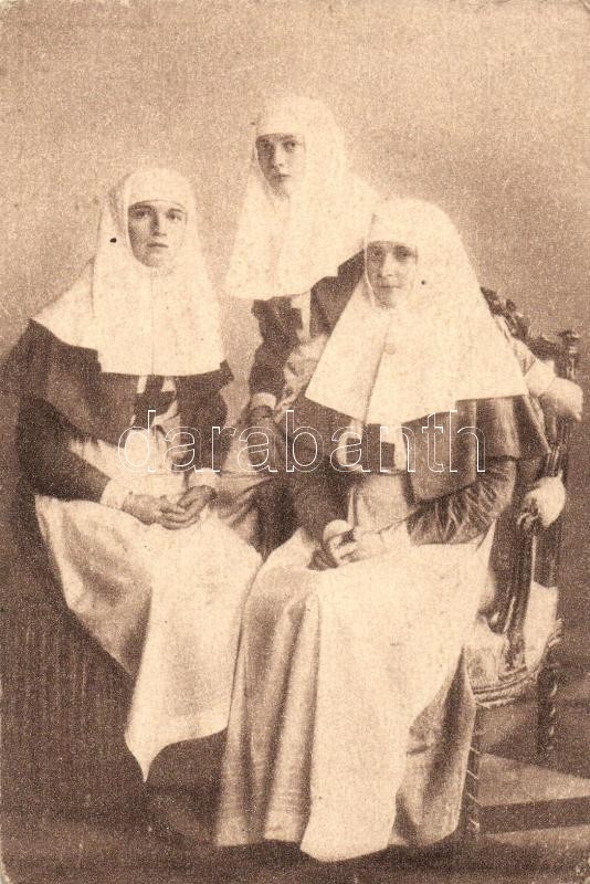 Alexandra Feodorovna, Empress of Russia and her daugthers, Grand Duchess Olga Nikolaevna and Grand Duchess Tatiana Nikolaevna, in nursing uniforms (they treated wounded soldiers at a military hospital on the grounds of Tsarskoye Selo) (EK)