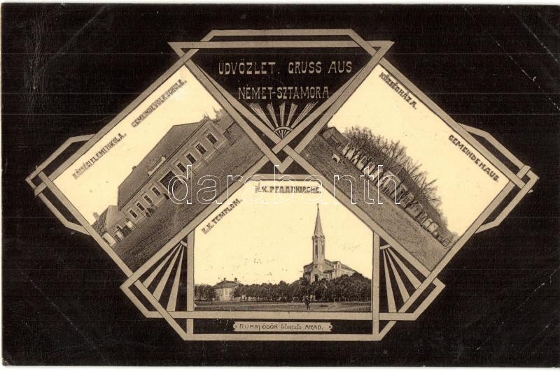 1907 Alsósztamora, Németsztamora, Stamora Germana; Gemeindevolkschule, Gemeindehaus, R. K. Pfarrkirche / Községi elemi iskola, Községháza, Római katolikus templom. Ruhm Ödön felvétele / elementary school, town hall, Catholic church (EK)