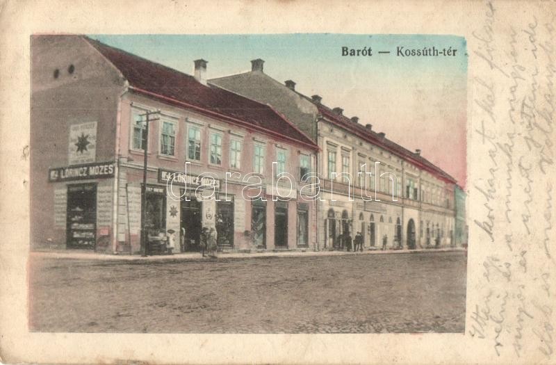 Beschreibung: Barót, Baraolt; Kossuth tér, Ifj. Lőrincz Mózes üzlete / street view, shops (fa)