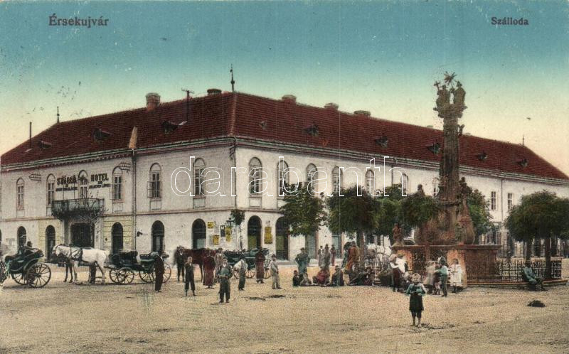 Beschreibung: Érsekújvár, Nové Zámky; Szálloda az Arany Oroszlánhoz, Szentháromság szobor / hotel, Trinity statue