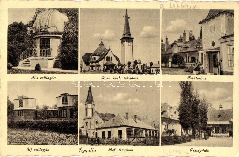 Ógyalla, Stará Dala, Hurbanovo; Kis csillagda (csillagvizsgáló), Római katolikus templom, Református templom, Feszty kastély, Új csillagda. Kiadja Hüttner Gyula / small observatory, Catholic church, Calvinist church, castle, new observatory (EK)