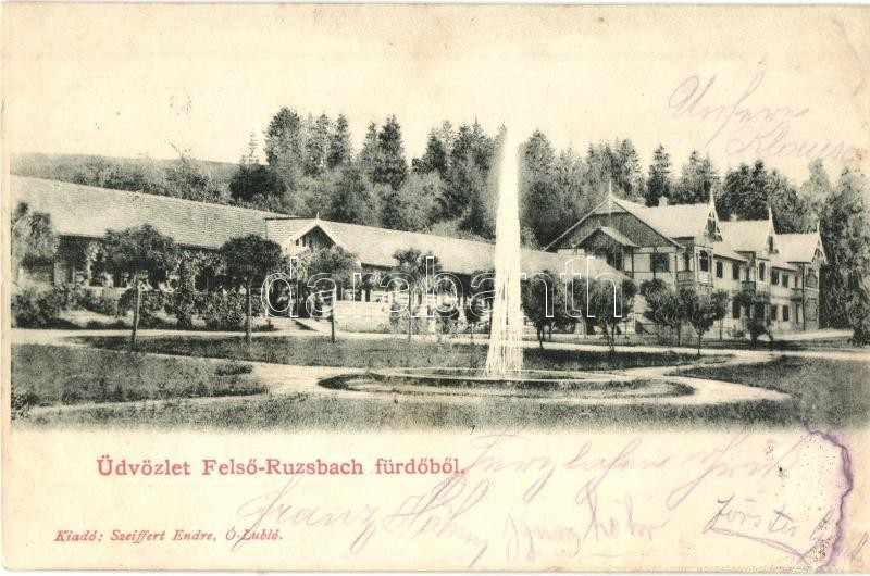 Beschreibung: Ruzsbach-fürdő, Kupele Ruzbachy; Felső-Ruzsbach, fürdőház és Mária nyaraló, Szeiffert Endre kiadása / spa, villa (ázott sarok / wet corner)