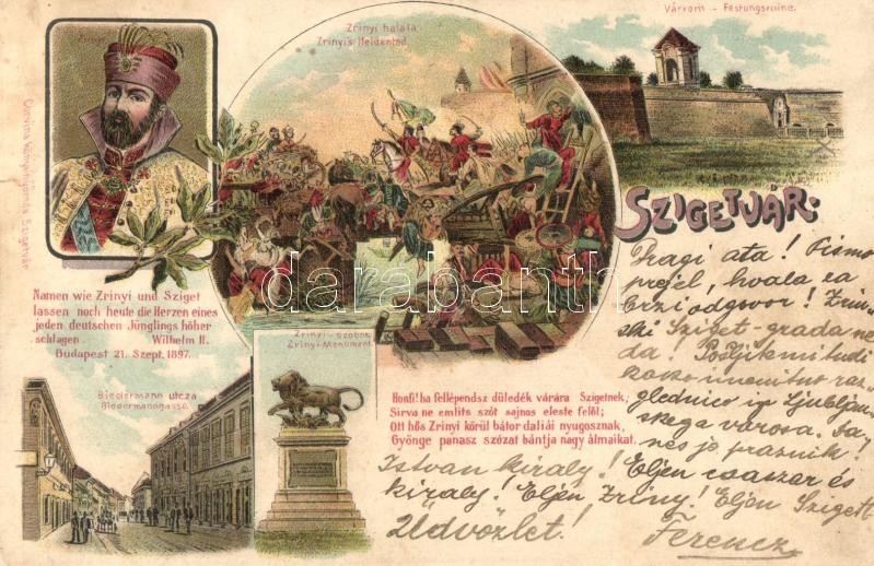 Beschreibung: 1901 Szigetvár, Várrom, Zrínyi halála és szobra, Biedermann utca; Corvin könyvnyomda, floral litho (kis szakadás / small tear)