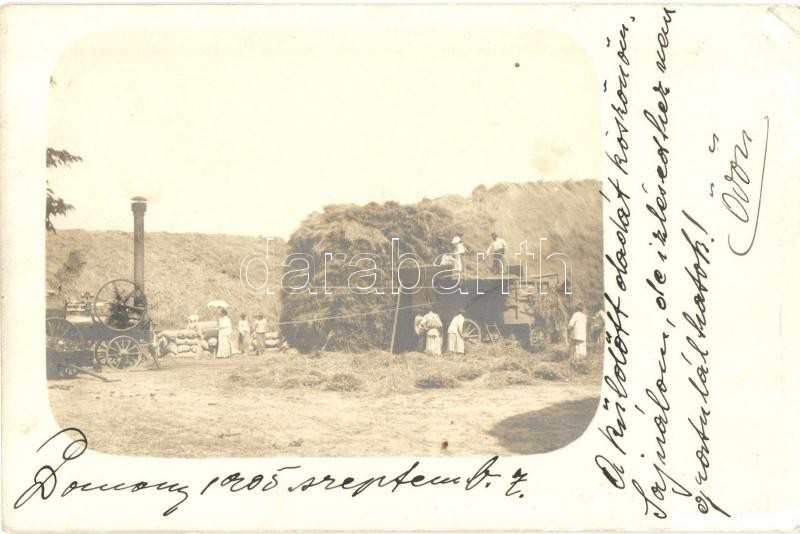 1905 Domony, mezőgazdasági munka, aratás, cséplés gőzgéppel a birtokon. "A küldött dadát köszönöm. Sajnálom, de ízlésedhez nem gratulálhatok!" - Domonyi Ödön nagybirtokos, kúria tulajdonos levele. photo (EK)