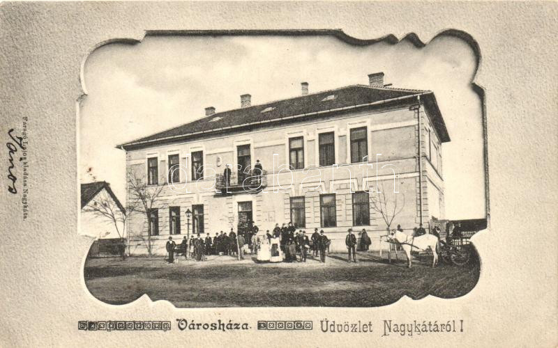 Beschreibung: 1905 Nagykáta, Városháza, hintó. Faragó Lajos kiadása