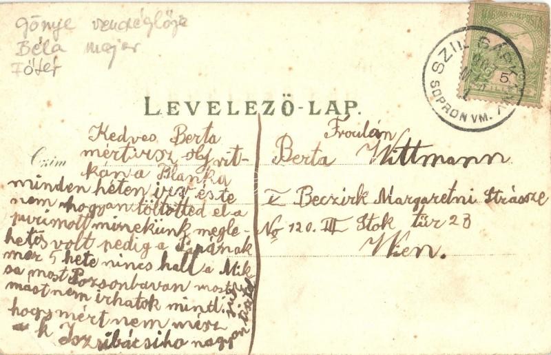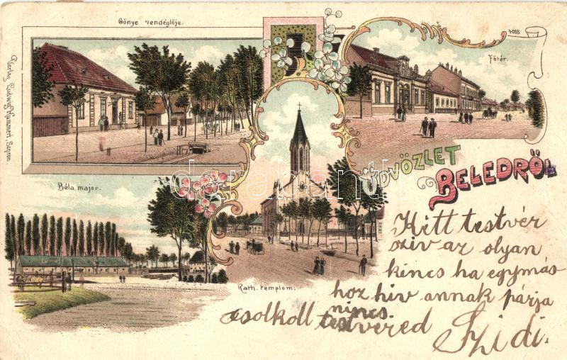 Beschreibung: 1907 Beled, Gönye vendéglője, étterem, Béla major, Fő tér, Katolikus templom. Kiadja Lugwig Kummert 4018. Art Nouveau, floral, litho (EK)