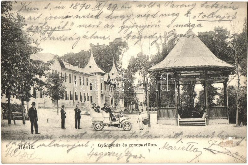 Beschreibung: Hévíz, György ház, zenepavilon, automobil, kiadja Mérei Ignác