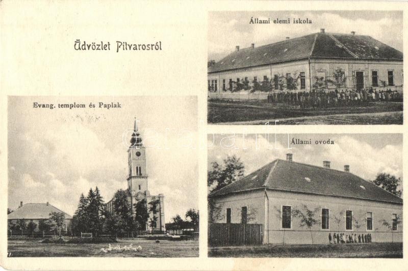 Pitvaros, Állami elemi iskola, Evangélikus templom és paplak, Állami ó... https://www.darabanth.com/de/330-Fernauktion/330.0/Ansichtskarten/Ungarn~2000004/Pitvaros-Allami-elemi-iskola-Evangelikus-templom-es-paplak-Allami-ovoda-apro-sarokhiany-~II1842087
