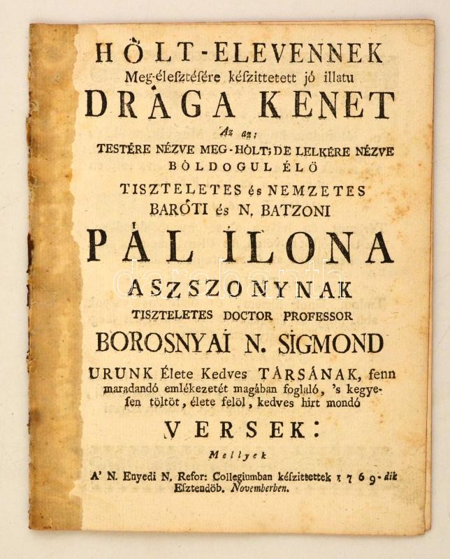 Beschreibung: Borosnyai Nagy Zsigmond: Holt-elevennek megélesztésére készÃttetett ... drága kenet, az az ... baróti és nagy batzoni Pál Ilona aszszonynak ... Borosnyai N. Sigmond urunk élete kedves társának fenn maradandó emlékezetét magában foglaló ... versek. Nagyenyed, 1769, Református Kollégium. Kötés nélkül, hiányos, az utolsó 6 folio hiányzik, 10 folio.