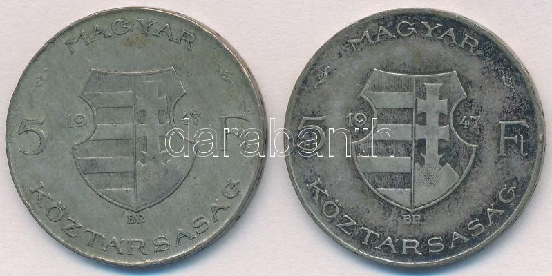 1947. 5Ft Ag "Kossuth" (2x) T:2-,3 patina https://www.darabanth.com/de/330-Fernauktion/330.0/Numismatik/Ungarische-Munzen-und-Munzen-mit-ungarischem-Munzzeichen~1000007/1947-5Ft-Ag-Kossuth-2x-T2-3-patina~II1840134