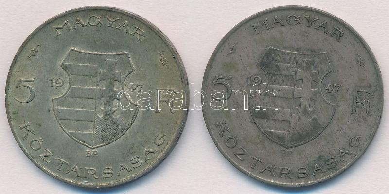 1947. 5Ft Ag "Kossuth" (2x) T:2-,3 patina https://www.darabanth.com/de/330-Fernauktion/330.0/Numismatik/Ungarische-Munzen-und-Munzen-mit-ungarischem-Munzzeichen~1000007/1947-5Ft-Ag-Kossuth-2x-T2-3-patina~II1841656