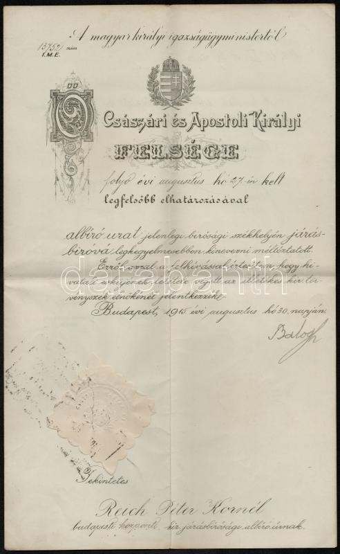 Beschreibung: 1915 Bp., Dekoratív kinevezési okmány Reich Péter Kornél részére Balogh Jenő (18664-1953) igazságügy-miniszter saját kezű aláírásával, szárazpecséttel
