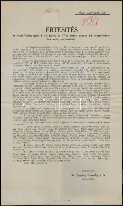 1918 Arad, Értesítés az Aradi Vadászegylet évi közgyűlésének fontosabb... https://www.darabanth.com/de/331-Fernauktion/331.0/Andere-Sammelgebiete/Drucksachen~500029/1918-Arad-Ertesites-az-Aradi-Vadaszegylet-evi-kozgyulesenek-fontosabb-hatarozatairol~II1828694
