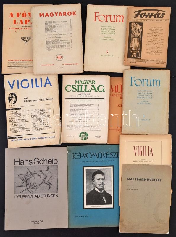 Vegyes nyomtatvány tétel, 12 db: 1928 Képzőművészet II. évf. 11. szám, 1930 A Műgyűjtő. 11. szám, 1939 A főnök lapja. III. évf. 3. szám, 1942 Magyar Csillag II. évf. 14. szám, 1943. Forrás. I. évf. 1. szám, 1947 Magyarok. III. évf. 11. szám, 1935-1948 Vigilia. XIII. évf. 12 szám, III. kötet Lisieuxi Szent Teréz, 1948-1949 Forum III. évf. 3., IV. évf. 1. szám,1988 Hans Scheib Figuren/Radierungen, Szokolay Béla: Mai Iparművészet (sérült, foltos). Különféle kiadásban, változó állapotban.