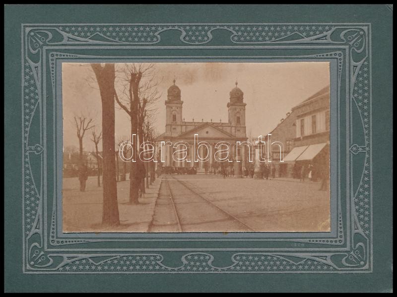 Beschreibung: 1908 Debrecen, Nagytemplom, utcakép, kartonra kasírozott fotó, feliratozva, 5×8 cm