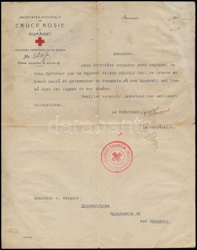 1917 Román Vörskereszt fejléces levél Gergely Pál magyar pilóta fogságba eséséről, francia nyelven, pecséttl, aláírással, 26,5x21 cm / Romanian Redd cross letter, about a captured Hungarian pilot, 26,5x21 cm