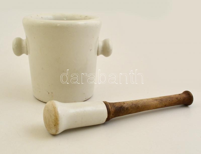 Drasche Porcellán Fayencegyár, Köszénbánya s Téglagyár Társulat Budapesten patikai porcelán mozsár törővel, jelzett, kopásnyomokkal, m: 16 cm, h: 30 cm