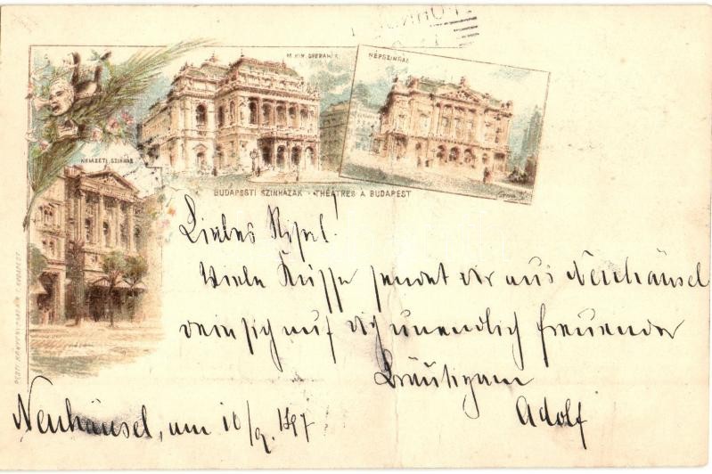 Beschreibung: 1897 (Vorälufer!) Budapest Ezredéves Országos Kiállítás, Színházak: Nemzeti Színház, M. Kir. Operaház, Népszínház. Brown 2 Kr Ga. litho s: Cserna (fa)