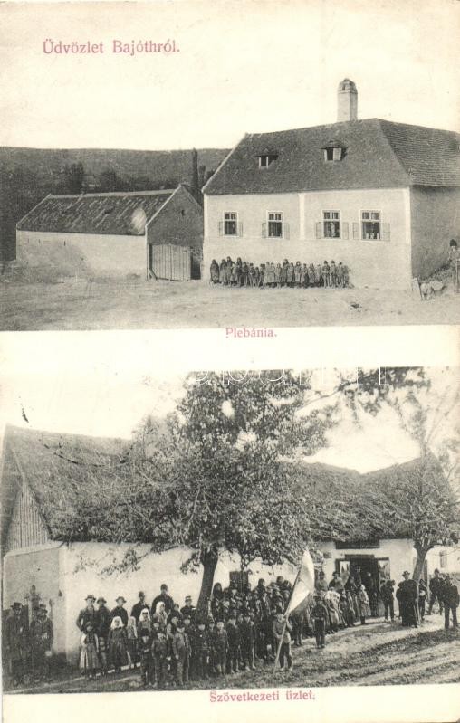Beschreibung: Bajót, Plébánia, Szövetkezeti üzlet, gyerekek magyar zászlóval. Kiadja a keresztény fogyasztási szövetkezet (EK)