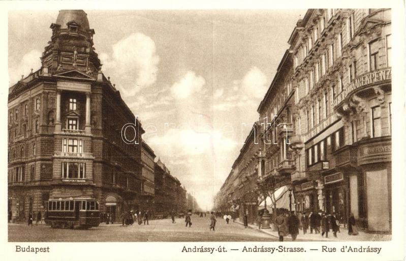 Beschreibung: Budapest VI. Andrássy út, takarékpénztár, Fonciere pesti biztosító, Schimmelpfeng W. tudakozóda, villamos